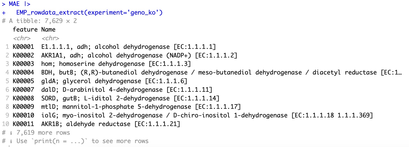 EMP_rowdata_extract指定了组学项目名称时,输出的是该组学项目的特征相关信息(例如:指定EMP_rowdata_extract(experiment='taxonomy'),则输出特征的界门纲目科属种株的分级注释;指定EMP_rowdata_extract(experiment='geno_ko'),则输出对应KO基因在KEGG数据库检索的相关信息。如果未指定参数experiment,则输出整个MAE对象中全部组学特征的相关信息。②此模块不支持参数