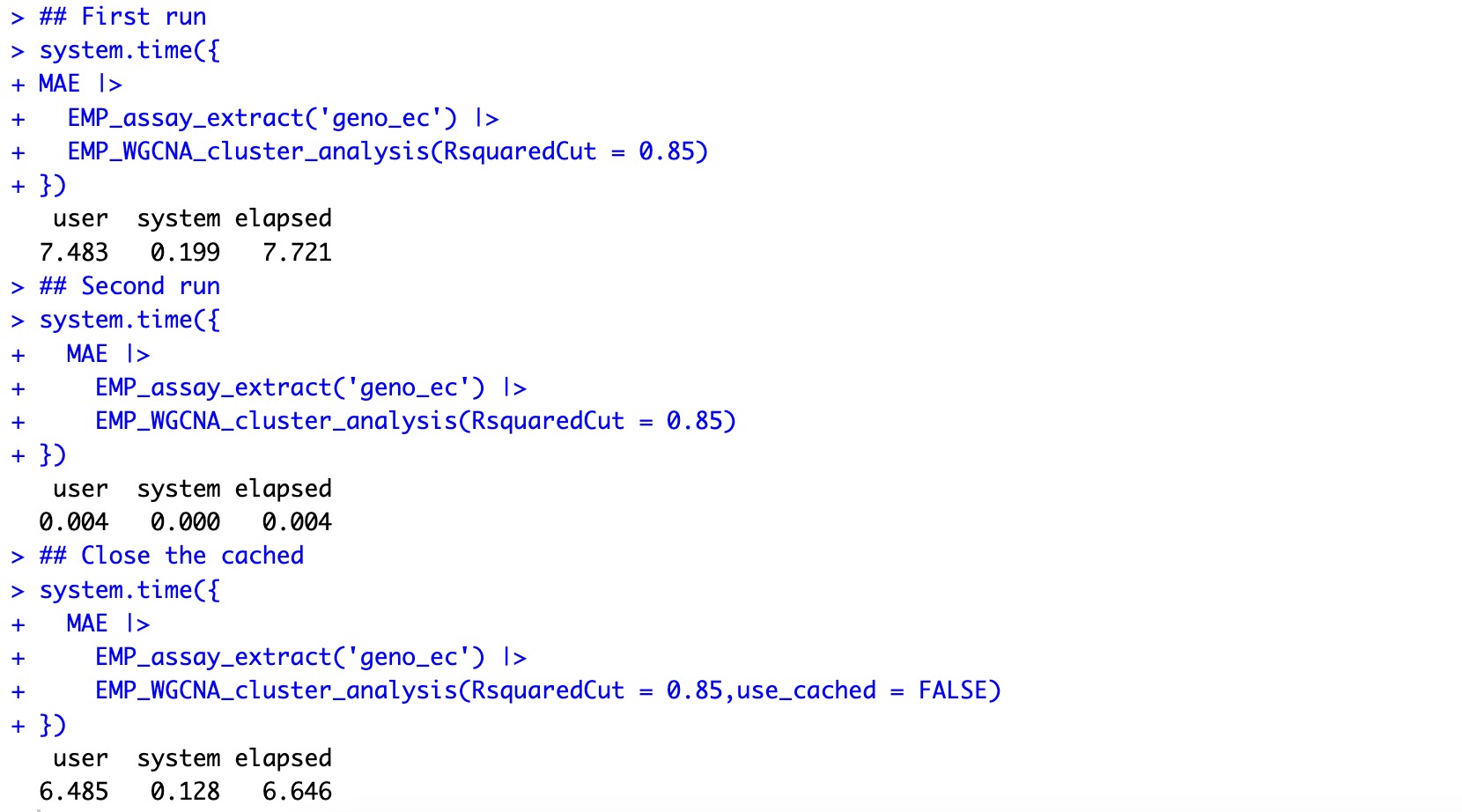 The main analysis modules of EasyMultiProfiler package have a cache snapshot mechanism, that is, when the same data is used for analysis repeatedly, the analysis process will automatically extract the corresponding data analysis results from the cache according to the hash value, so as to avoid double calculation. This caching feature greatly improves the convenience of the analysis process and avoids the need to create multiple intermediate variables in traditional data analysis to store complex computing results. Users only need to pass the current calculation results through the |> operator to successfully complete each analysis step, making the entire analysis process clearer and more concise.