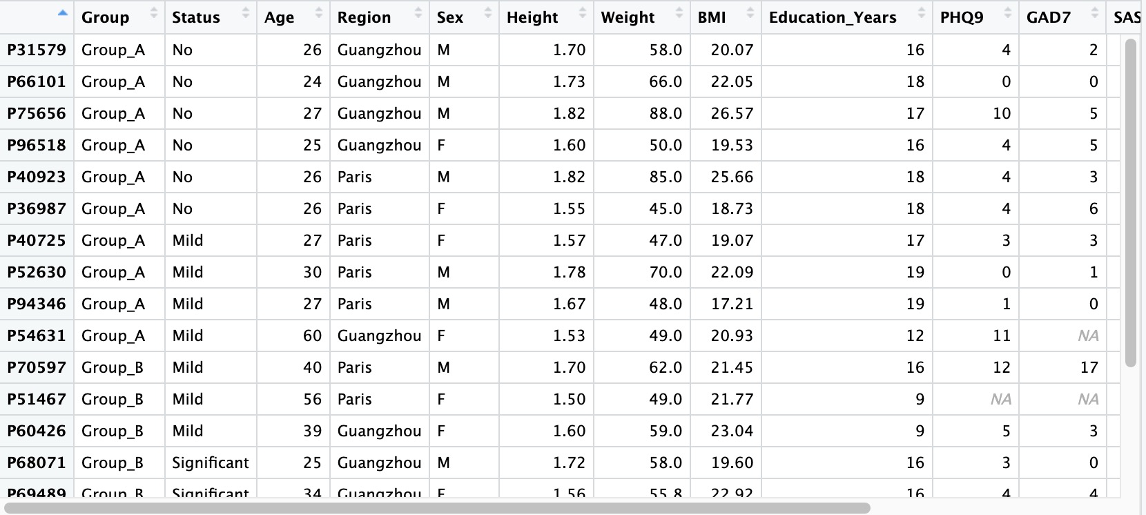 Sample-related data refers to the basic information of the subject, usually including: the subject's general demographic data (gender, age, residence, etc.), anthropometric data (height, weight, waist circumference, etc.), psychological scale score results (anxiety scale, depression scale, sleep scale, etc.), test results (blood routine, liver function, inflammatory factors, etc.).